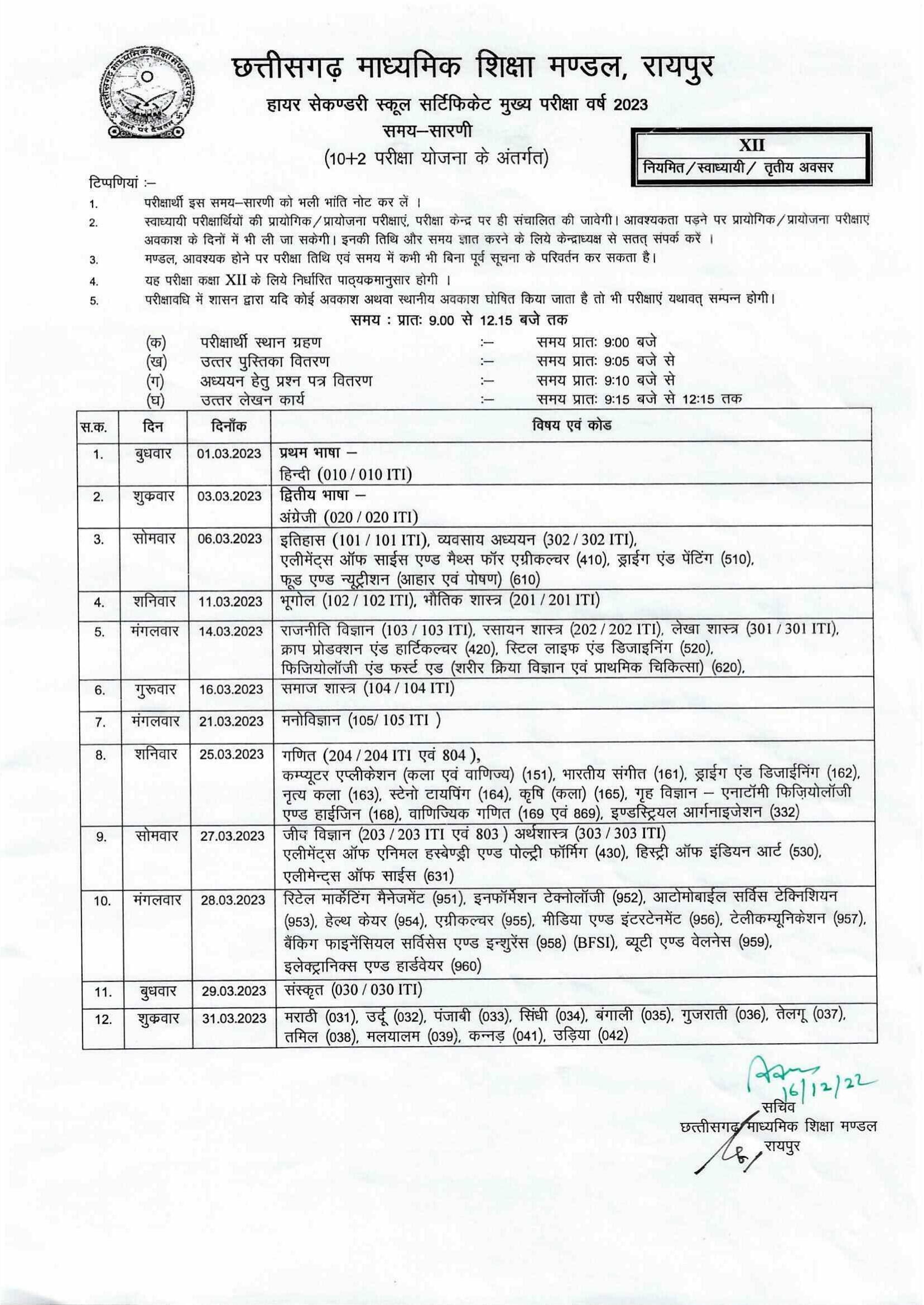 Students can go through the table given below to check the CG Class 12 board exam dates for the academic year 2022-23: