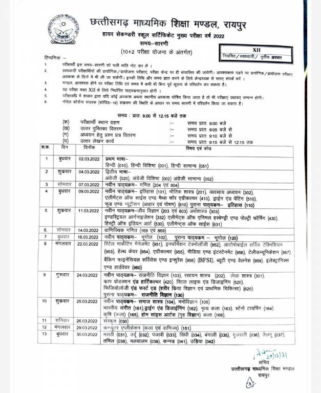 Students preparing for CGBSE 10th and 12th board exams 2022 will have to reach the exam venue by 9 am. Question papers will be distributed at 9:05 am and starting 10 minutes will be given to the students to read the question papers. They can start answering the questions from 9:15 am.