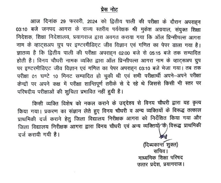 Amidst mounting pressure, the District Inspector of Schools (DIOS) has taken swift action, lodging a report against the center administrator of Atar Singh Inter College, Raujhauli Kirawali, and others at the Fatehpur Sikri police station. However, the full extent of the leak's reach remains unclear, with reports emerging of similar incidents in Mainpuri as well.