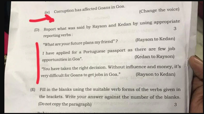 In the Goa Board class 10 English exam held last week, the question that sparked controversy described a conversation between two persons, wherein one says he has to opt for a job in Portugal because of jobs being scarce here, and that one needs to have influence and money to get a job.