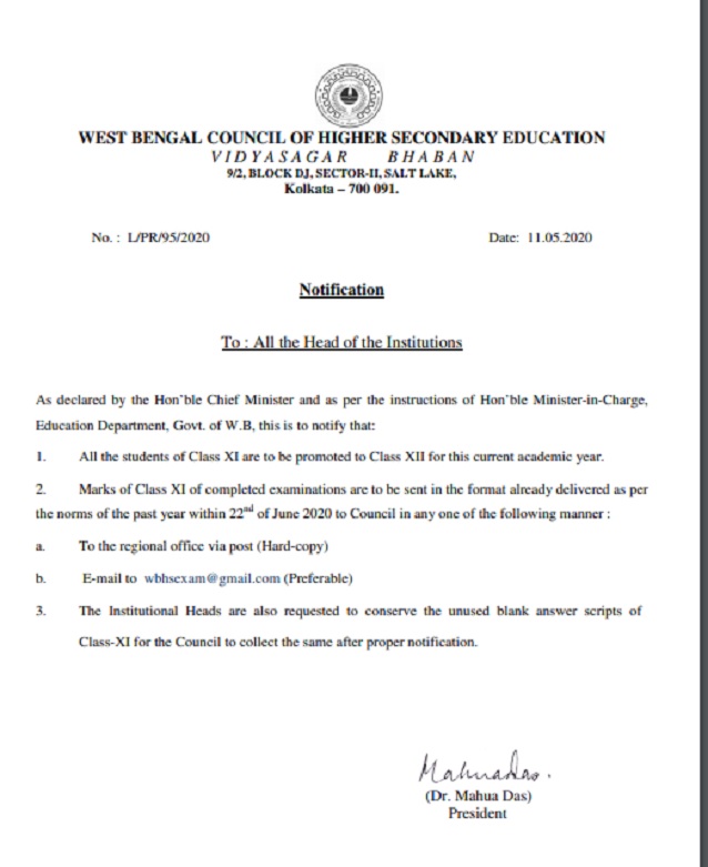 "All the students of Class XI are to be promoted to Class XII for this current academic year," the notification from the WBCHSE said.