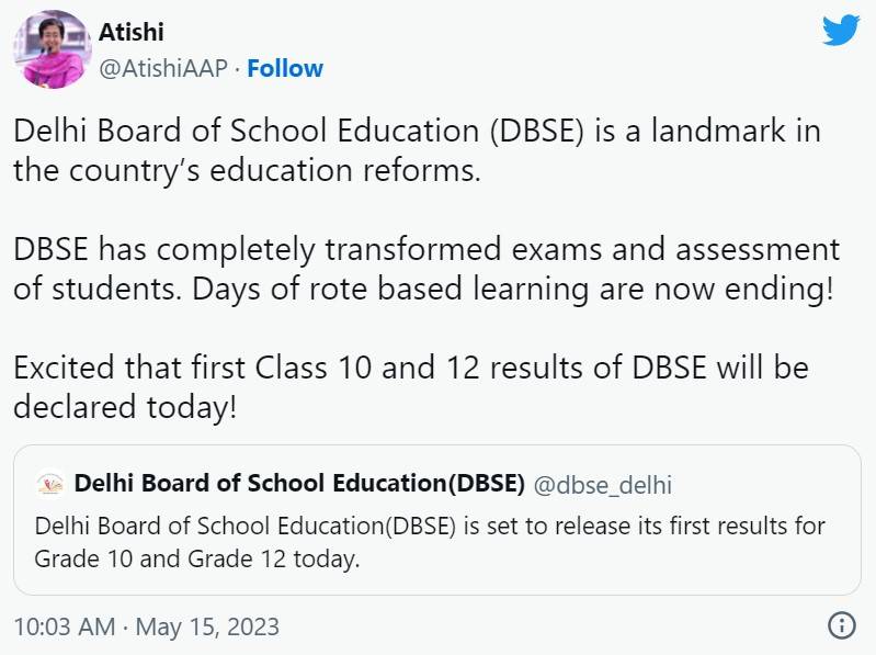 According to the latest tweet posted by "Delhi Board of School Education (DBSE) is a landmark in the country’s education reforms. DBSE has completely transformed exams and assessments of students. Days of rote based learning are now ending! Excited that first Class 10 and 12 results of DBSE will be declared today!" Atishi said in a tweet.