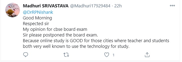 Another Twitter user named Madhuri Srivastava said, โGood Morning Respected sir my opinion for CBSE Board exam . Sir please postpone the board exam. Because online study is GOOD for those cities where teachers and students both are very well known to use the technology for study.โ