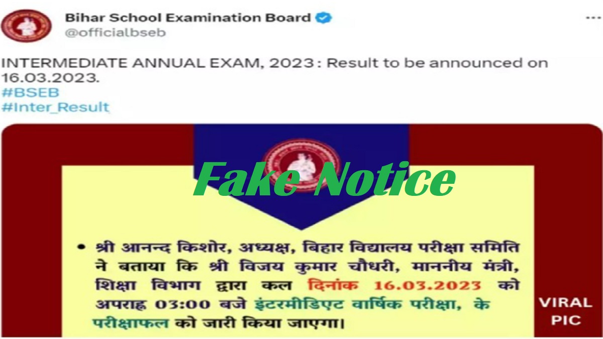 The fake notice states that "Anand Kishore, BSEB Chairman has stated that Vijay Kumar Chaudhary, the state education minister will be presenting the BSEB Intermediate Results on March 16, 2023, at 3 PMβ.
