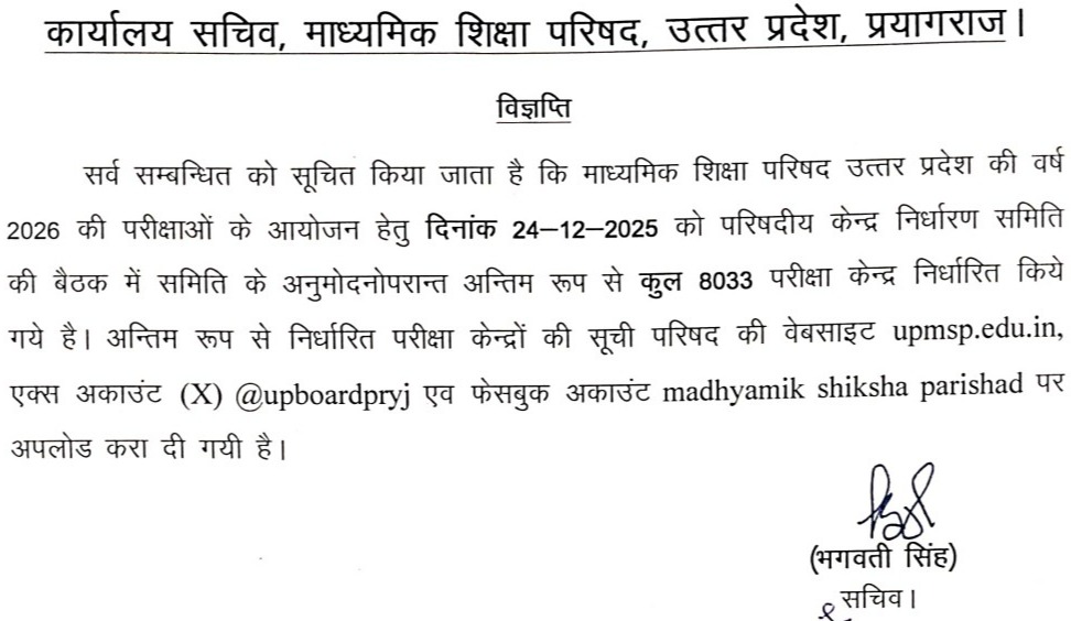 Here is the official notification for the release of the final UPMSP Board Exam Center List 2026 Class 10, 12: