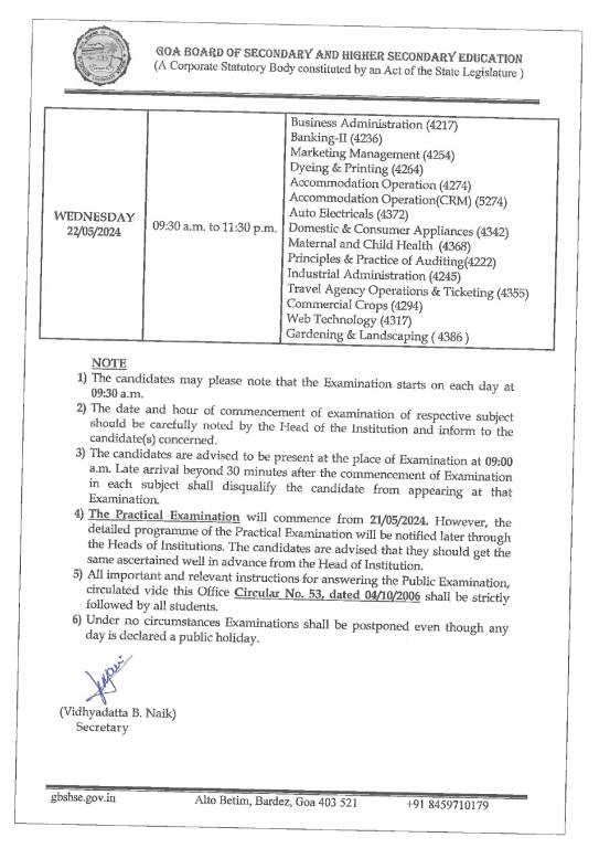 Goa Board HSSC Supplementary Exam 2024 Time Table