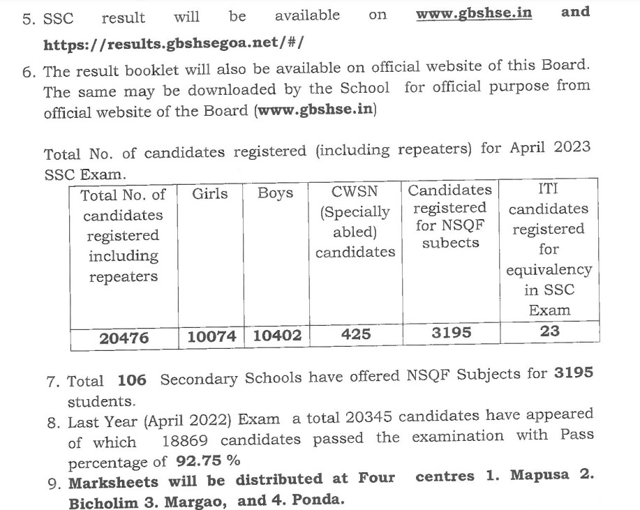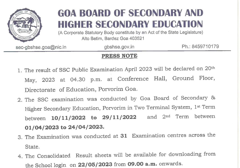 Screenshot of press note regarding the Goa 10th result 2023 given below.