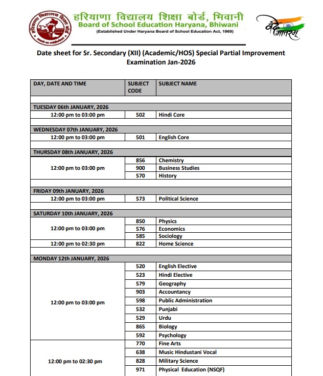 HBSE Date Sheet 2025 Class 12 OUT for Special Partial Improvement Examination! Board of Secondary Education (BSEH), Haryana, released the HBSE Class 12 date sheet 2025 for the Special Partial Improvement Examination on the official website- bseh.org.in. The HBSE 12th improvement exams 2025 will be held between January 6 and 14, 2026. Students who wish to improve their marks in subjects can appear for the examinations, which will be conducted in pen and paper format.
