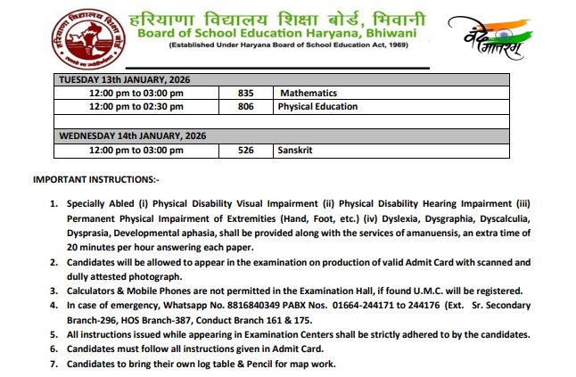 The HBSE date sheet 2025 Class 12 mentions the exam dates, days, timings, and general guidelines for students. The HBSE 12th admit card 2025 will likely be out in the first week of January 2026. Students must carry it on all exam days otherwise they will not be allowed to write the exam.