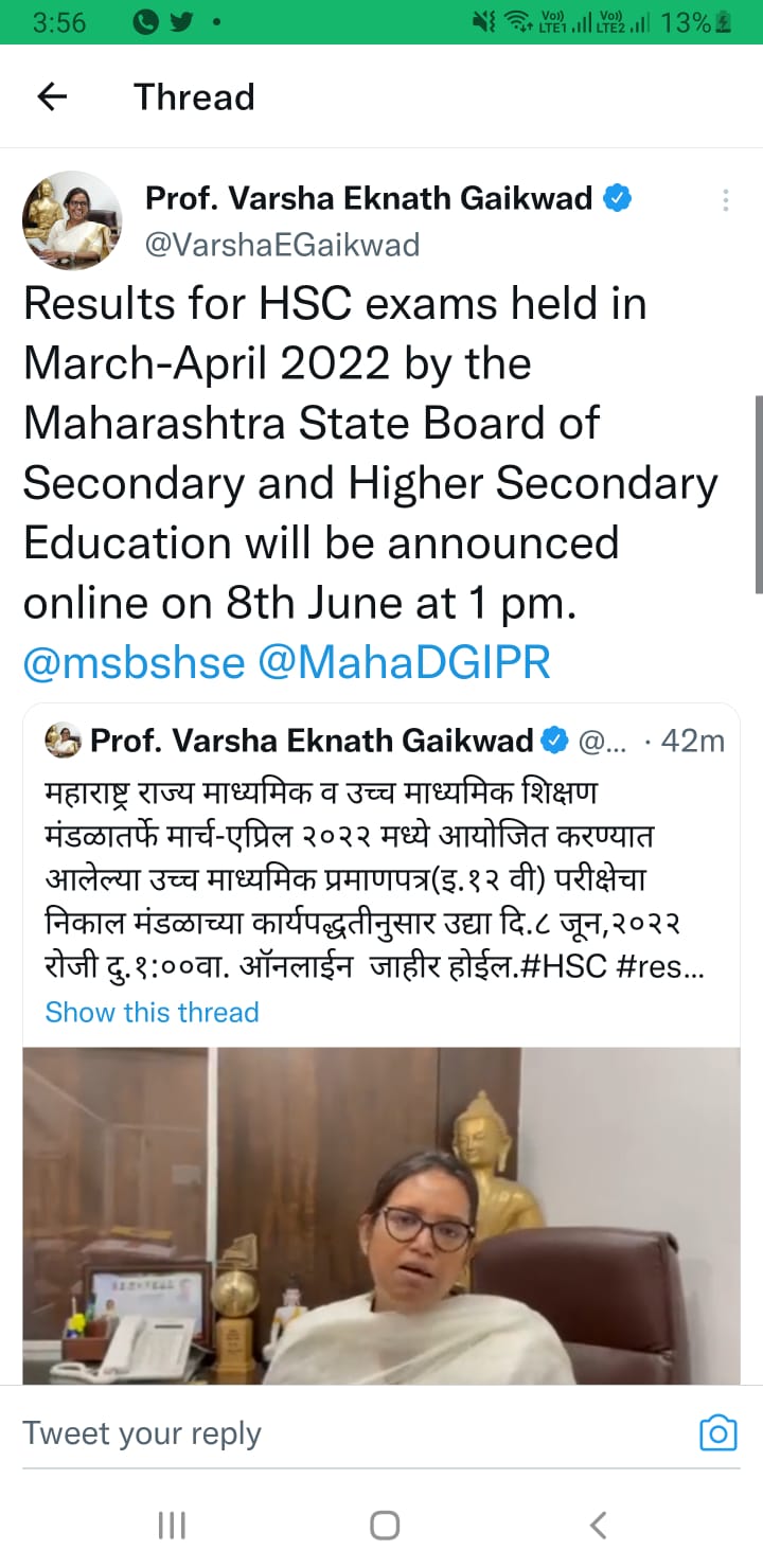 Maharashtra education minister Varsha Gaikwad announces 12th result 2022 Maharashtra board date via social media