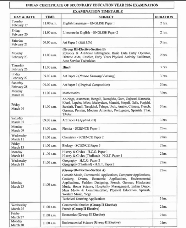 ICSE 10th time table 2026 was released on November 13, 2025 on the official website- cisce.org.