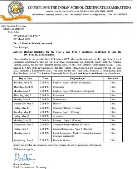 | ISC 12th Time Table 2022 (Revised for Type 3 / Type 4) |