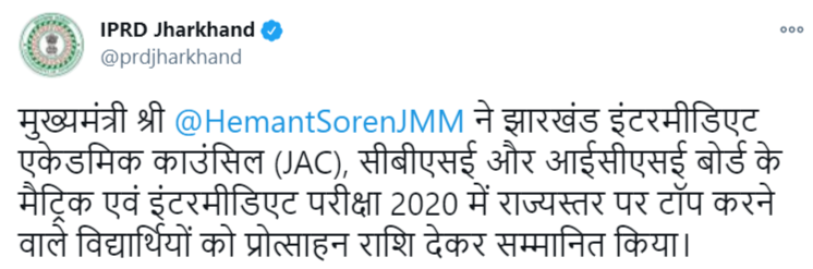 The Information and Public Relations Department, Jharkhand Government, stated: βHemant Soren has awarded incentives to the students who have topped the state level in the Matriculation and Intermediate Examination of Jharkhand Intermediate Academic Council (JAC), CBSE and ICSE Board in 2020.β