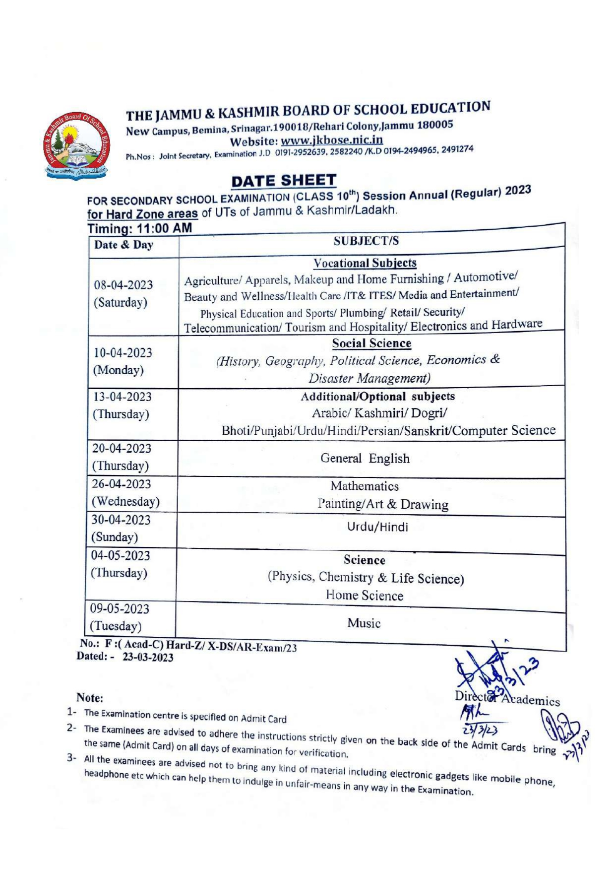 JKBOSE 10th Date sheet 2023 for Hard Zone
