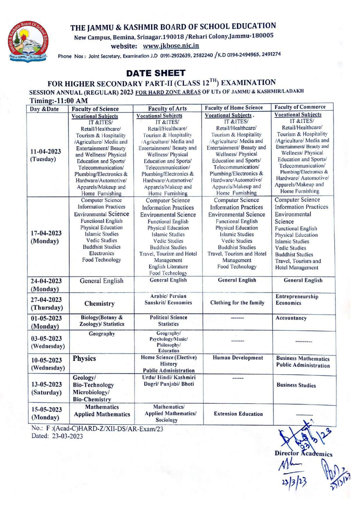 JKBOSE 12th Date sheet 2023 for Hard Zone