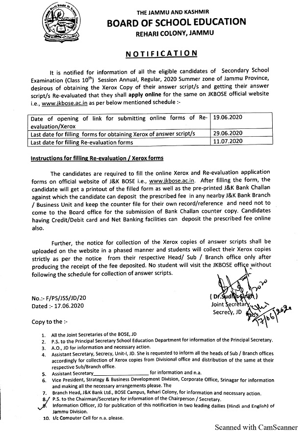 An official statement issued by JKBOSE stated, “Students desirous of obtaining the Xerox Copy of their answer script/s and getting their answer script/s Re-evaluated that they shall apply online for the same on JKBOSE official website i.e., jkbose.ac. as per below-mentioned schedule: