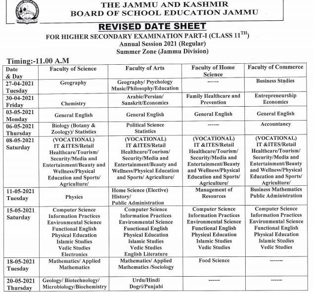 JKBOSE Class 11 Date Sheet 2021