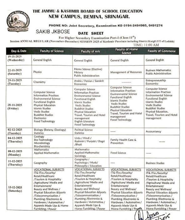 General English exam is scheduled first on November 8 for all three streams. Detailed subject-wise dates for JK Board 12th Arts, Science and Commerce can be checked on this page.