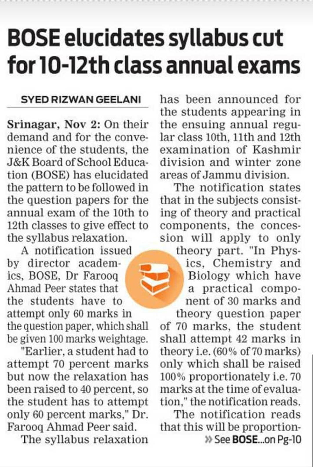 Dr Peer states, " Earlier, a student had to attempt 70 percent marks but not the relaxation has been raised to 40 percent, so the students are required to attempt only 60 percent marks." According to the reports the syllabus relaxation is announced for the students appearing in the ensuing annual regular Class 10, 11, 12 examinations of Kashmir division and winter zone areas of Jammu division.