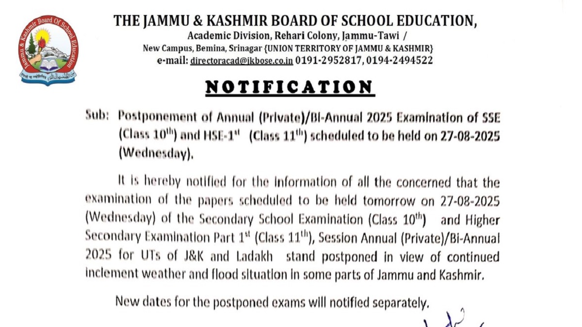 βIt is hereby notified for the information of all concerned that the examinations scheduled for tomorrow, 27-08-2025 (Wednesday), of the Secondary School Examination (Class 10) and Higher Secondary Examination Part 1 (Class 11), Session Annual (Private)/Bi-Annual 2025 for the UTs of Jammu & Kashmir and Ladakh, stand postponed in view of continued inclement weather and flood situations in some parts of Jammu and Kashmir,β reads the official notification.