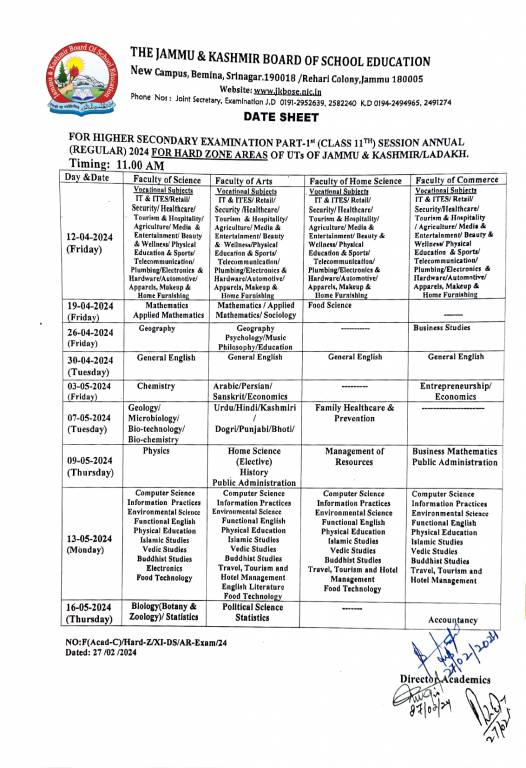 JKBOSE Class 11 date sheet 2024 for Hard Zone PDF