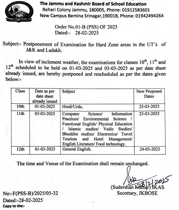 The JKBOSE has also clarified that the exam time and venue for all rescheduled exams will remain unchanged. Students are advised to follow the same schedule for arriving at their exam centers as they would have for the originally scheduled dates.