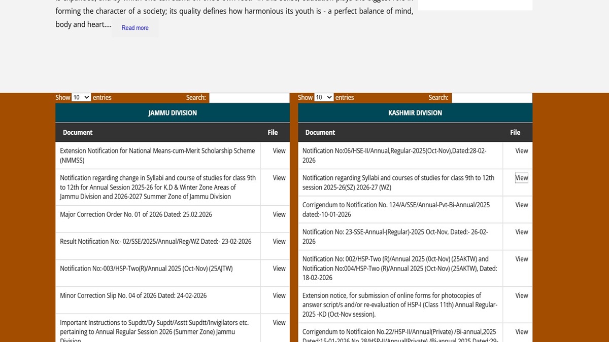 For Class 11, the revised subjects include Punjabi and Physical Education. For Class 12, changes have been made in Education and Environmental Science. The question papers for the regular and fresh candidates scheduled for October-November 2026 in the Kashmir Division and winter zone areas of the Jammu Division will be set as per the new syllabus. Besides, the question papers for February–March 2027 in the summer zone areas of the Jammu Division will be set in accordance with the revised syllabi for these subjects.