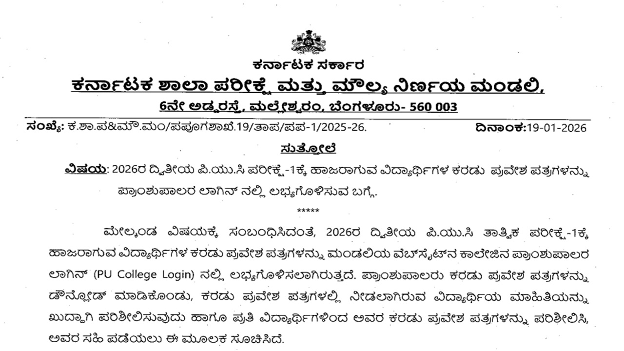The Karnataka School Examination and Assessment Board (KSEAB) released a circular regarding the availability of Karnataka 2nd PUC draft admit card 2026 on the official website - kseab.karnataka.gov.in/. As per the circular, the draft admission letters of the students appearing for the 2nd PUC exam 2026 is available on the college principal's login of the board website. The Principals should download the 2nd PUC draft admit card 2026 and check the details of each student. The steps to be followed by college heads, in case of any errors are also mentioned in the circular.