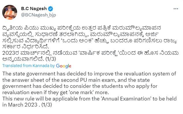 “The state government has decided to improve the revaluation system of the answer sheet of the second PU main exam, and the state government has decided to consider the students who apply for revaluation even if they get 'one mark' more. This new rule will be applicable from the 'Annual Examination' to be held in March 2023,” tweeted the Karnataka Education Minister.