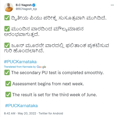 Karnataka 2nd PUC Result 2022 will be released in June third week, evaluation to begin next week, said Education Minister BC Nagesh.