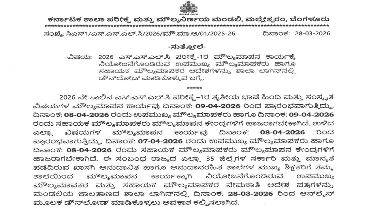 Karnataka SSLC exam 2026 answer sheet evaluation: The Karnataka School Examinations and Assessments Board (KSEAB) has announced that the Karnataka SSLC exam 2026 evaluation of answer sheets will begin from April 8, 2026. The Karnataka board has published a circular on the official website regarding the Karnataka SSLC exam 2026 answer sheet evaluation. The Karnataka SSLC exam 1 result 2026 will be released in May 2026. The evaluation of third language Hindi and Sanskrit will start from April 9, 2026.