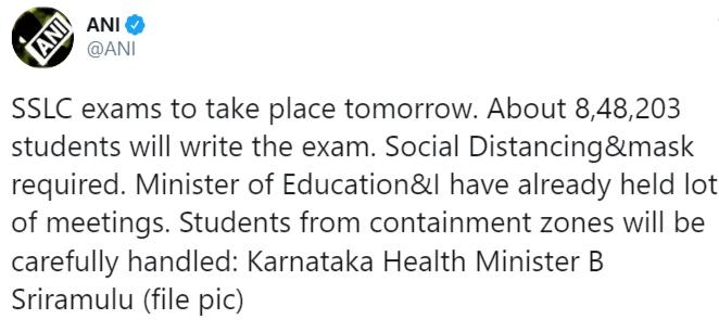 While addressing the media, Karnataka Health Minister B Sriramulu said, โSSLC exams to take place tomorrow. About 8,48,203 students will write the exam. Social Distancing&mask required. Minister of Education & I have already held lot of meetings. Students from containment zones will be carefully handled.โ