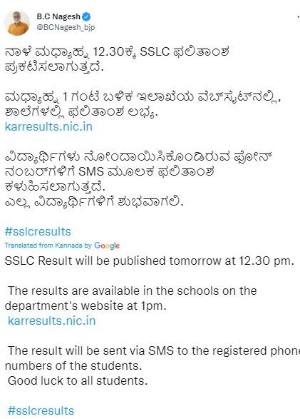 Education Minister B.C Nagesh informed, “SSLC Result will be published tomorrow at 12.30 pm. The results are available in the schools on the department's website at 1pm. karresults.nic.in. The result will be sent via SMS to the registered phone numbers of the students. Good luck to all students.”