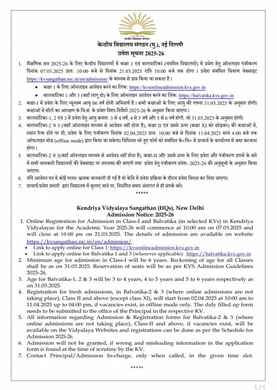 KV Admission 2025: Kendriya Vidyalaya (KV) Sangathan has officially announced the admission schedule for the upcoming academic session. As per the notification, online applications for admission to Class 1 and Balvatika (1, 2, and 3) will begin on March 7, 2025, at 10 AM. The registration process will remain open until March 21, 2025, at 10 PM.