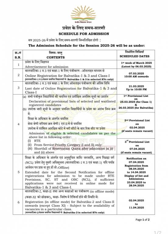 KV Class 1 Admission 2025 Timeline