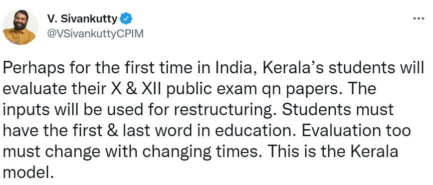 The official tweet posted by the Kerala School Education Minister V Sivankutty mentioned, "Perhaps for the first time in India, Keralaβs students will evaluate their class 10 and 12 public exam question papers. The inputs will be used for restructuring. Students must have the first and last word in education. Evaluation too must change with changing times. This is the Kerala model."