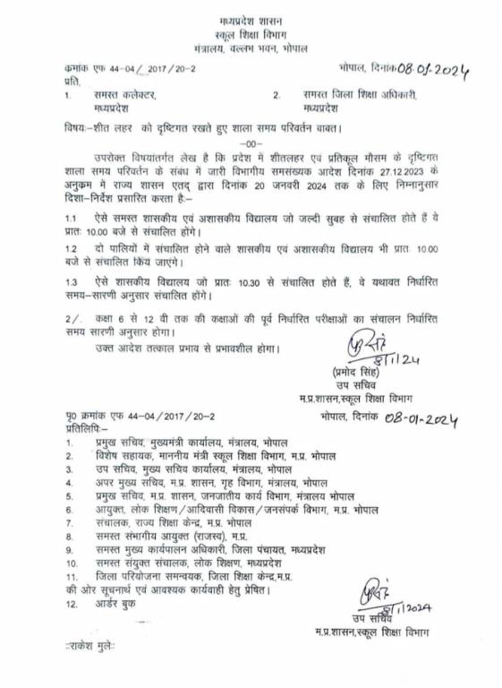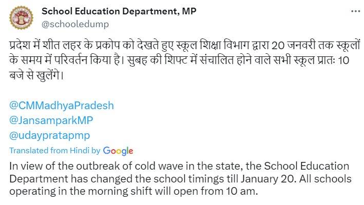Earlier, in Bhopal, timings for schools which are run in morning shift, were extended from 7:00 am to 9:00 am. And now, it has been extended until 10:00 am. Earlier, schools were closed from December 31 to January 4, 2024 during winter vacation.