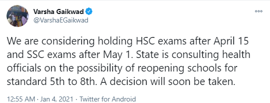 Tweeting the information, Varsha Gaikwad wrote, ‘We are considering holding HSC exams after April 15 and SSC exams after May 1. The state is consulting health officials on the possibility of reopening schools for standard 5th to 8th. A decision will soon be taken.’ The screenshot of the tweet is provided below: