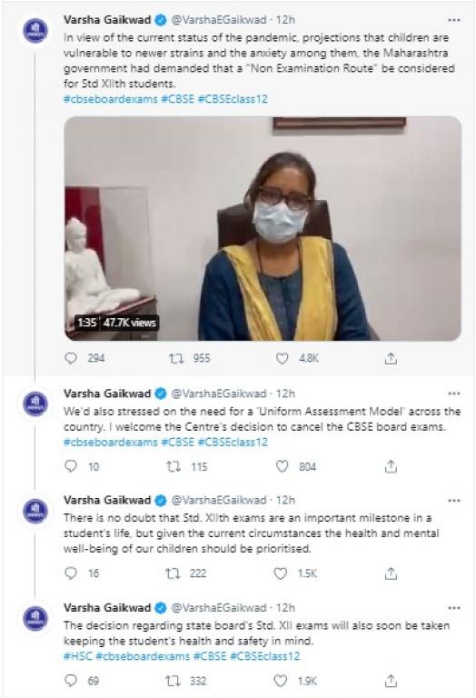 Gaikwad shared her message via recorded message on Twitter. She said that the decision on HSC exams would be taken keeping the safety and mental health of the students. “There is no doubt that Class 12 exams are an important milestone in a student's life but given the current circumstances the health and mental well-being of our children should be prioritised,” she added.
