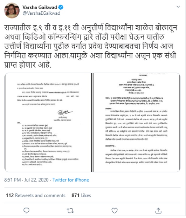 Maharashtra Education Minister Varsha Gaikwad has announced that the state schools will give another opportunity to students who had failed in the 9th and 11th standard. The HSC and SSC admissions will be granted to such students on the basis of the oral exams. The schools will be conducting the oral exams by inviting the students to their respective schools or through video conferencing. This has been done to provide another chance to the students who could for some reason not pass their exams. The minister made the announcement through her twitter handle to provide the details on the exams.