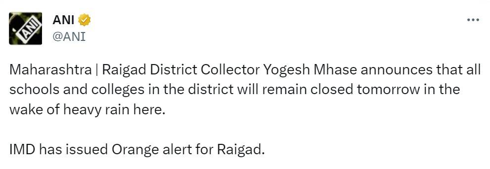 As an orange alert has been issued by the IMD for Raigad district, Yogesh Mhase, the collector of Raigad District, announced the closure of all schools and colleges in the district. A social media post says, “Raigad District Collector Yogesh Mhase announces that all schools and colleges in the district will remain closed tomorrow in the wake of heavy rain here. IMD has issued an Orange alert for Raigad."