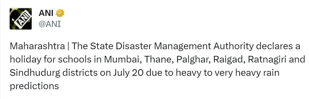 Another social media said, “Maharashtra | The State Disaster Management Authority declares a holiday for schools in Mumbai, Thane, Palghar, Raigad, Ratnagiri and Sindhudurg districts on July 20 due to heavy to very heavy rain predictions."