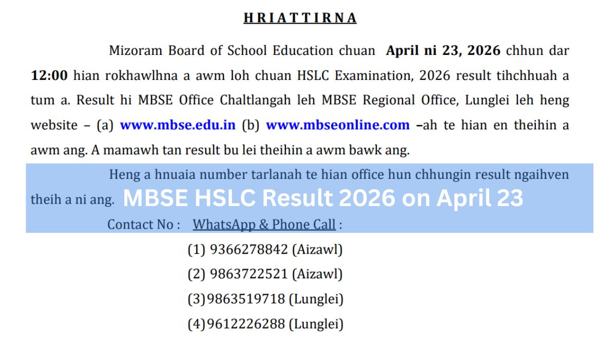 MBSE HSLC Result 2026: Mizoram Board of School Education has confirmed that MBSE class 10 HSLC result will be announced tomorrow, April 23, 2026. Students who appeared for board exams can get Mizoram Board class 10th result online at mbse.edu.in or mbseonline.com at 12 PM.