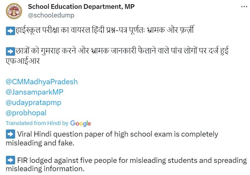 The administration has also warned of legal action against people spreading fake news about the MP Board Class 10 exam paper. According to media reports, district education officer (DEO) Manglesh Kumar Vyas also informed that the administration’s probe revealed that the reports about the Class 10 Hindi paper being leaked on social media were fake.