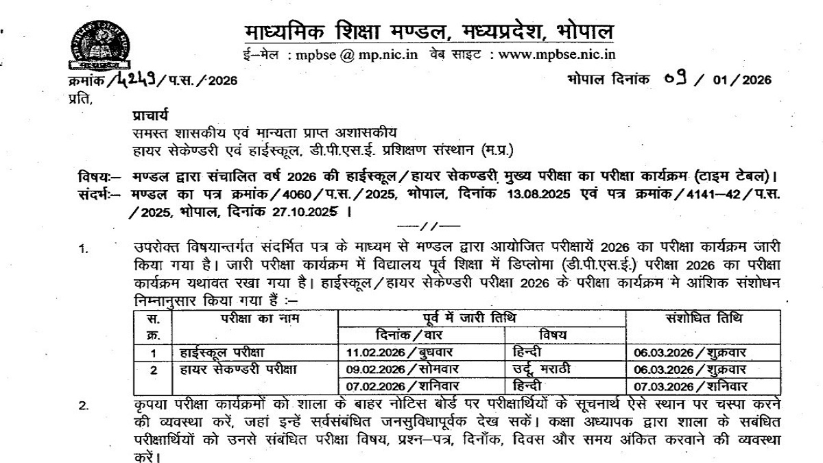 The Madhya Pradesh Board of Secondary Education (MPBSE) has revised the MP Board exam date 2026 for class 10 and 12. As per the MPBSE revised timetable 2026, the new schedule not only includes a change in exam dates but also reorders some major subjects, including Hindi. The board has announced that MPBSE class 10 and 12 exam dates have been revised for students convinience.