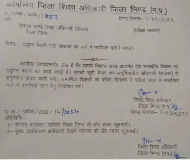 MP Board exams 2022: In order to stop mass cheating in the ongoing Madhya Pradesh 10th 12th board exams 2022, the Bhind district education officer in Madhya Pradesh released an official order to prepare a list of all tuition teachers and asked all of them to be present at the nearest police station until the time exams get over. Madhya Pradesh Board of Secondary Education (MPBSE) commenced the Class 12 board exams on February 17 and now, DEOβs decision to gather tuition teachers in has gone viral on social media.