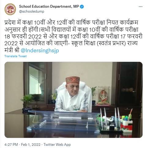 MP Board Class 10, 12 exams 2022 to be conducted as per schedule, Minister of State for School Education (Independent Charge) Inder Singh Parmar said via his official Twitter account.