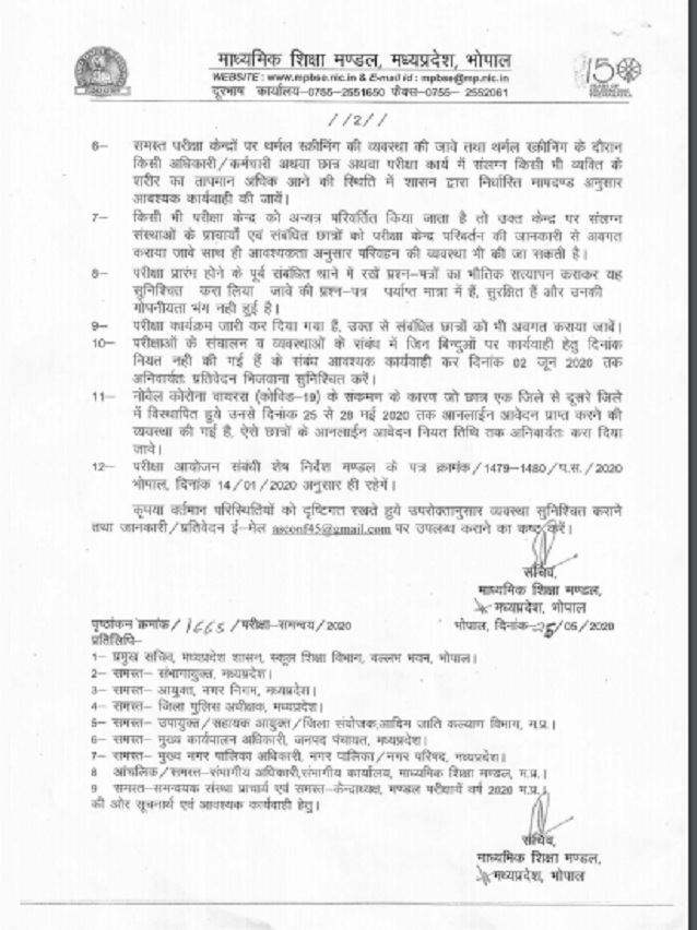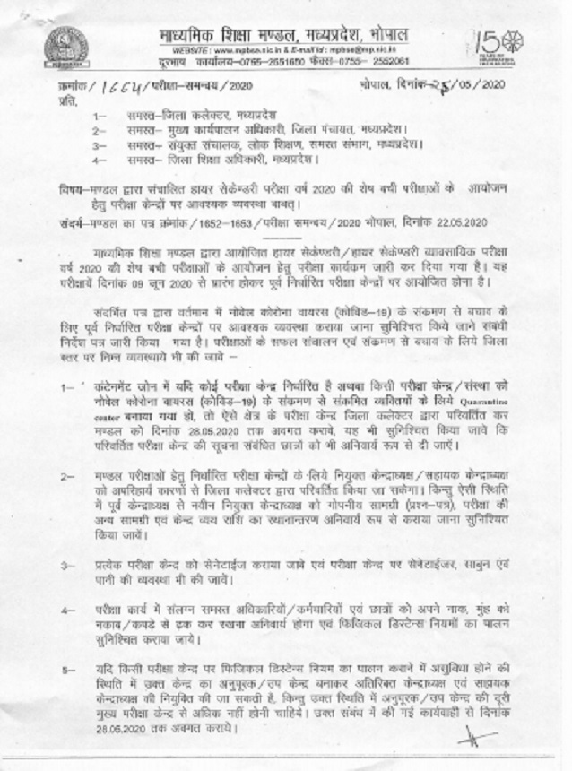 As per the guidelines issued by the state government, MPBSE will be shifting all the examination centres which fall in containment zones or have been transformed into quarantine centres for the safety of all the candidates appearing for the examinations.