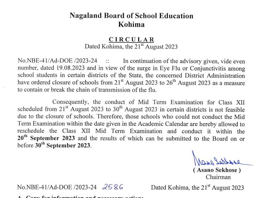 Amid the severe spread of eye flu, various schools ordered closure to contain the transmission of eye flu among students. The Class 12 mid-term exams were scheduled to be held from August 21 and August 30. Considering the closure of the schools, the decision on rescheduling has been taken.