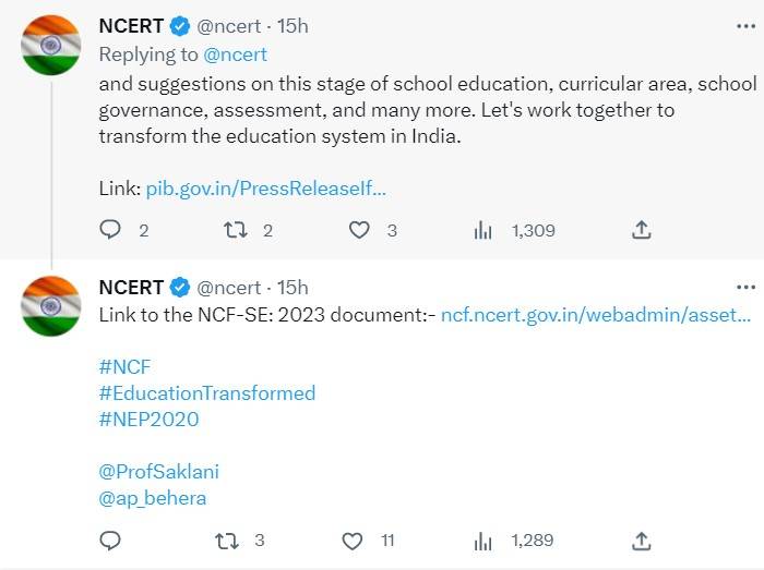 NCERT through its official Twitter handle informed that the Ministry of Education is seeking feedback from the stakeholders on NCF-SE-2023 draft document. The tweet said, “Attention all education stakeholders! Have you heard about the National Curriculum Framework for School Education (NCF-SE)-2023 draft document? The Ministry of Education is seeking feedback on the NCF-SE for the school education system in India. Share your thoughts, comments”